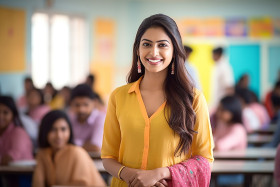 Indian female teacher smiling in a classroom