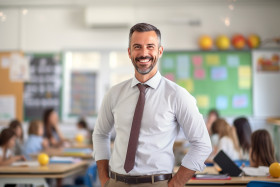 education teacher male smiling friendly work school student learning teaching profession career occupation job person adult man blur background classroom lesson board books chalkboard markersImagine Buddy