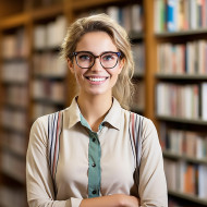 librarian female woman smiling friendly work job library book books bookshelves reading studying learning knowledge education help customer service blur background blurred background blur portrait headshot professional smile friendly face bookworm nerd geekImagine Buddy