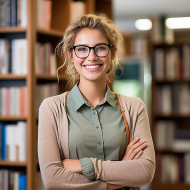 librarian female woman smiling friendly work job library book books bookshelves reading studying learning knowledge education help customer service blur background blurred background blur portrait headshot professional smile friendly face bookworm nerd geekImagine Buddy