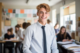 student high school male friendly smiling at work blurred background education learning youth teenager boy school schoolwork homework study happy positive bright smart intelligent motivated driven focused dedicated hardworking successful achievement successImagine Buddy