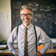 education science teacher male friendly smiling work blurred background classroom lab experiment lab coat microscope blackboard chalk whiteboard equipment book project fair knowledge learning teachingImagine Buddy