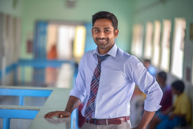 indian teacher male friendly smiling work blurred background education school classroom happy positive lesson teaching students learning knowledge wisdom guidance mentor role model inspiration success achievement future hopeImagine Buddy