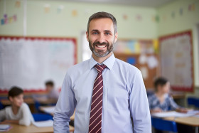 friendly teacher male school work blurred background smiling education happy classroom student lesson lecture learning knowledge teaching schoolroom chalkboard whiteboard pointerImagine Buddy