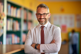 friendly teacher male school work blurred background smiling education happy classroom student lesson lecture learning knowledge teaching schoolroom chalkboard whiteboard pointerImagine Buddy