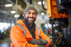 Cheerful bus mechanic repairing vehicle against a blurred background