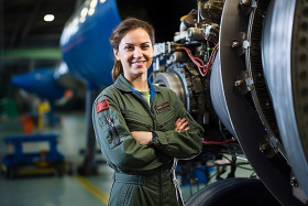 transportation models aviation mechanic female woman aircraft airplane engineer maintenance repair technician professional skilled confident friendly smiling happy workplace hangar blurred background occupation careerImagine Buddy
