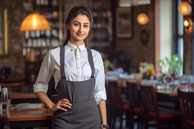 Indian woman waiter working blurred background