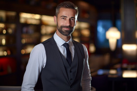 concierge man confident work blurred background hotel luxury hospitality service professional business people customer guest assistance information travel tourism accommodations reservations dining transportation activities amenities facilitiesImagine Buddy