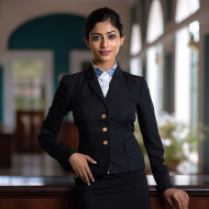 confident indian woman concierge work blurred background hospitality service professional confident customer service reception hotel business smile friendly welcome assistant help reception desk lobby manager greeting guest staff employee uniform badge nametag technologyImagine Buddy