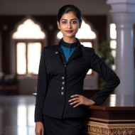 confident indian woman concierge work blurred background hospitality service professional confident customer service reception hotel business smile friendly welcome assistant help reception desk lobby manager greeting guest staff employee uniform badge nametag technologyImagine Buddy