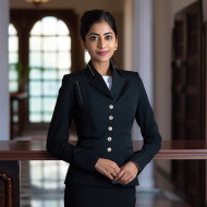 confident indian woman concierge work blurred background hospitality service professional confident customer service reception hotel business smile friendly welcome assistant help reception desk lobby manager greeting guest staff employee uniform badge nametag technologyImagine Buddy