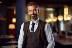 concierge man confident work blurred background hotel luxury hospitality service professional business people customer guest assistance information travel tourism accommodations reservations dining transportation activities amenities facilitiesImagine Buddy