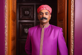 indian man doorman confident work blurred background hotel building entrance smile uniform greeting welcoming friendly helpful polite professional service hospitality business security safety protectionImagine Buddy