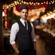 confident man waiter work blurred background restaurant food drink service customer professional friendly polite attentive smile happy friendly helpful hardworking dedicated enthusiastic confident experienced knowledgeableImagine Buddy