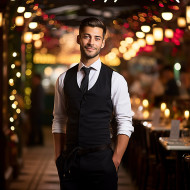 confident man waiter work blurred background restaurant food drink service customer professional friendly polite attentive smile happy friendly helpful hardworking dedicated enthusiastic confident experienced knowledgeableImagine Buddy