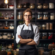 confident woman cook work blurred background restaurant kitchen chef food cooking apron hat stove knife spoon fork pot pan spatula ingredients recipe delicious tasty professional skilled experienced passionate creative innovativeImagine Buddy
