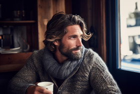handsome man coffee cozy cafe cup latte cappuccino espresso breakfast lunch snack break relax enjoy happy satisfied content smile window table chair wood light warm cozy interior atmosphere mood lifestyle people travel food drinkImagine Buddy
