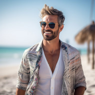 fashion man beach beachfront resort relaxation vacation summer sun sand water ocean waves palm trees umbrella chair towel sunglasses hat shirt shorts swimwear flip-flops sandals sunscreen drinks food happy smiling enjoying lifestyle travel leisureImagine Buddy
