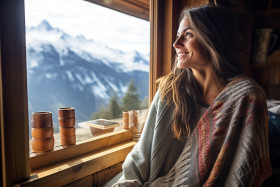 beautiful woman mountain chalet view admiring nature scenery landscape mountain chalet woman beauty scenery nature outdoor adventure vacation travel holiday explore sunrise sunset morning evening winter summer spring fallImagine Buddy