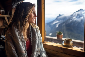 beautiful woman mountain chalet view admiring nature scenery landscape mountain chalet woman beauty scenery nature outdoor adventure vacation travel holiday explore sunrise sunset morning evening winter summer spring fallImagine Buddy