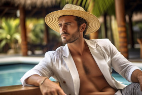 man pool tropical resort relax vacation holiday travel luxury getaway stylish summer vacation beach palm trees ocean blue sky white sand towel sunglasses hat drink food smile happy leisure relaxation swimming water sun lounge chairImagine Buddy