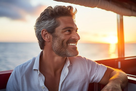 yacht sunset cruise ocean sea sky sunset cruise luxury relaxation vacation leisure enjoyment happiness lifestyle travel adventure outdoors nature scenery people man relaxed happy smile enjoyingImagine Buddy