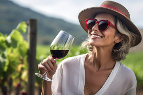 sophisticated woman wine vineyard glass elegant luxury lifestyle class beautiful young happy peaceful serene nature outdoors summer sunshine grapes vines countryside wineryImagine Buddy