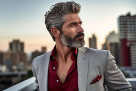 man rooftop bar city view night lights cityscape suave handsome stylish sophisticated urban cosmopolitan luxury lifestyle upscale chic trendy cocktail drink glass sky skylineImagine Buddy
