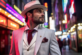 dapper man exploring nightlife cosmopolitan city urban lights bright neon cityscape skyline street sidewalk buildings architecture business fashion style handsome confident sophisticated attractive metro urbaniteImagine Buddy
