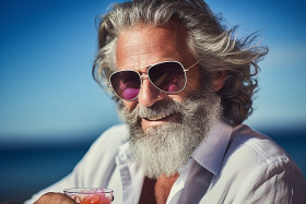 beachside bar cocktail suave man sipping enjoying relaxed stylish handsome sophisticated drink vacation summer holiday luxury tropical paradise ocean sunset sunset palm treesImagine Buddy