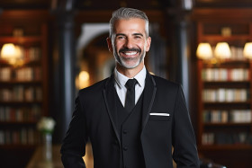 concierge friendly smiling man work blurred background hotel customer service reception hospitality help service uniform welcome desk lobby guest greeting assistance information directions recommendations reservationsImagine Buddy