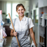 woman smile housekeeper work blurred cleaning service happy professional friendly home domestic help household female lifestyle adult young occupation maid interior job cleaning lady cleaning woman chore mop broom duster vacuum cleaner bucket spongeImagine Buddy