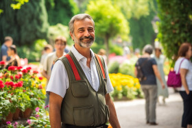 tour guide man smiling friendly work blurred background travel vacation sightseeing tourist attraction destination city country world people group tour group leader show explain information knowledge experience helpful friendlyImagine Buddy