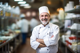 chef cooking smiling happy friendly restaurant kitchen food work cooking cooking show uniform hat apron stove pots pans utensils knife cutting board ingredients vegetables meat seafood spices herbs plating serving customer order menuImagine Buddy