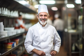 chef cooking smiling happy friendly restaurant kitchen food work cooking cooking show uniform hat apron stove pots pans utensils knife cutting board ingredients vegetables meat seafood spices herbs plating serving customer order menuImagine Buddy