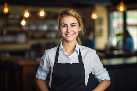 restaurant hospitality service work woman waiter waitress food smile friendly happy cheerful blurred background customer satisfaction focus foreground people human adult female employee blur bokeh uniform tray tableImagine Buddy