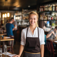 friendly smiling woman waiter at work blurred background restaurant service hospitality food drink menu order customer happy cheerful positive friendly professional uniform apron tray smile laughing joy happiness cheerful positive satisfied contentImagine Buddy