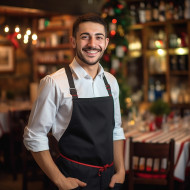 waiter male friendly smiling work blurred background restaurant cafe business service food drink customer happy friendly helpful attentive smiling professional neat clean uniform apron tray table chairs glasses bottles plate cutlery food drink menu bill money payment tip service charge friendlyImagine Buddy