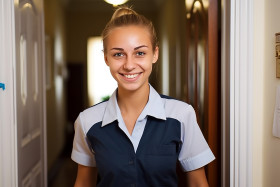 Smiling woman doorkeeper on blurred background