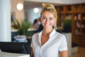 receptionist woman friendly smiling work blurred background office desk computer phone smile happy cheerful professional confident helpful customer service reception blur office desk computer phone smile happy cheerful professional confident helpful customer service reception businessImagine Buddy