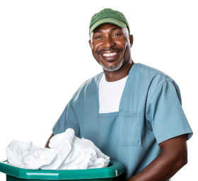 laundry worker man friendly smiling isolated white background happy service professional uniform apron cleaning clothes washing drying folding ironing pressing delivery pickup customer satisfactionImagine Buddy
