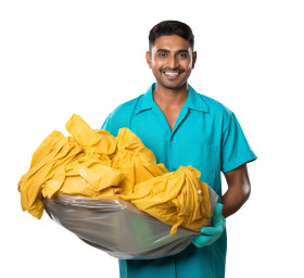 indian man laundry worker smiling friendly white background isolated profession occupation job service uniform shirt pants apron detergent soap water machine dryer clothes washing folding ironing delivery cleaningImagine Buddy