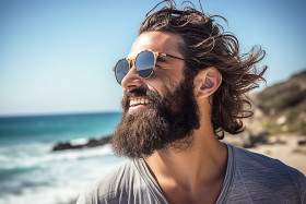 beach man handsome vacation summer travel lifestyle nature water sand sea sky horizon palm trees sun clouds waves boat seagull happy relaxed carefree smiling laughing content joyful peaceImagine Buddy