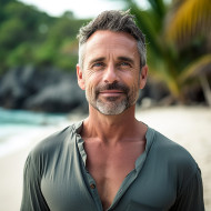 man beach tropical vacation paradise relax relax luxury lifestyle lifestyle handsome groomed stylish trendy fashionable sunglasses hat swimsuit trunks towel sand sea water ocean waves palm treesImagine Buddy