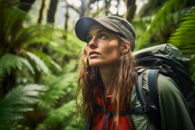 hiking young woman new zealand nature lush greenery outdoors adventure travel explore mountains rainforest ferns trees waterfall lake river stream trail scenery beauty fresh air sunshine wilderness freedom peaceImagine Buddy