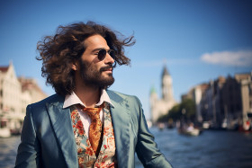 Romantic gondola ride in venice with stylish man