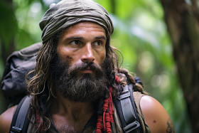 rugged adventurer jungle trek wilderness exploration adventure travel nature outdoors hiking backpacker camping hiking trails canopy rainforest lush green exotic tropical humid wildlife animals birds monkeys insects snakes rivers waterfalls mountainsImagine Buddy