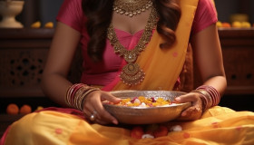 Sister with pooja plate and rakhi waiting alone for her brother on the occasion of raksha bandhan