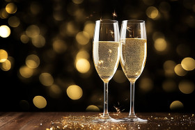 Champagne glasses toasting against a twinkling background